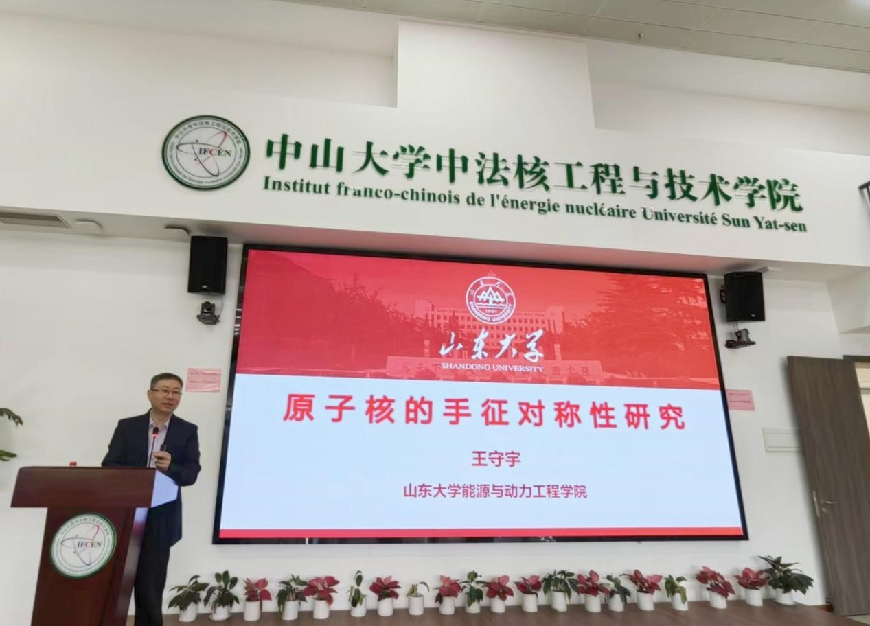 调研期间,王守宇一行参观了中法核学院教学和科研实验室,并详细了解了实验体系建设及核电环境监测与应急系统研发情况。王守宇受邀为中法核学院师生做题为《原子核的手征对称性研究》报告。
