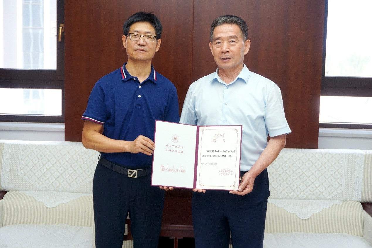 王小平为孙德山颁发了《山东大学研究生合作导师》证书,李永卫代表学院为孙德山董事长和吕扬副总经理两位校友送去慰问,并邀请两位校友常回学院。双方还就人才招聘、项目合作等内容进行了交流。