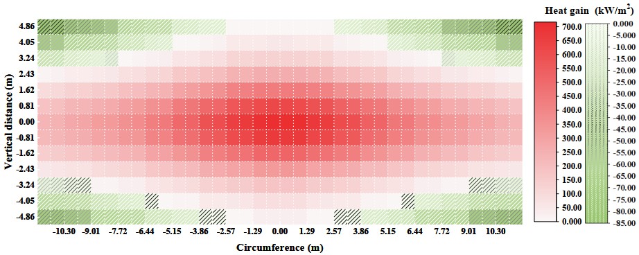 图2塔式吸热器表面净得热分布图(塔式吸热器二维展开图)及负能流区(斜线填充区域)