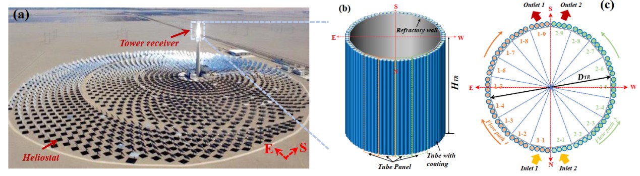 图1 敦煌10MWe塔式发电系统: (a) 塔式发电站布局图; (b) 塔式吸热器示意图; (c)塔式吸热器的流道分布俯瞰图