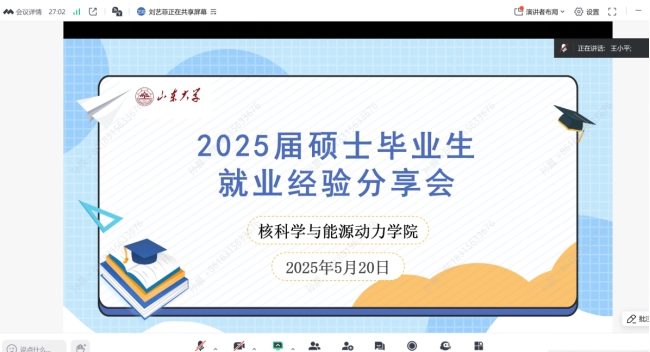 为引导学生科学规划职业发展路径,全面提升就业竞争力,5月20日,核科学与能源动力学院举办2025届硕士毕业生就业经验分享会。学院邀请10位毕业生代表围绕签约就业、考公考编、境内读博、境外读博四个方面进行经验分享。学院党委副书记王小平、研究生辅导员刘晓凤以及100余名学生线上参加活动。
