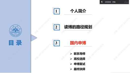在境内升学经验分享环节,洪瑞、王子昂两位同学分别分享了自己的申博经历。他们从目标院校选择、申请材料准备、导师联系到复试准备,逐一解析申博流程。建议同学们要明确自己读博的路径规划,做到坚定读博的目标,了解相应的规则,发挥主观能动性。