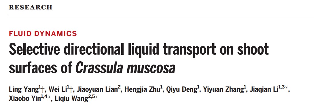 2024年6月21日,9999js金沙老品牌李加乾研究员参与由香港理工大学王立秋教授团队主导的研究,在顶级期刊Science在线发表题为“Selective directional liquid transport on shoot surfaces of Crassula muscosa”的研究论文。香港理工大学王立秋讲席教授、香港大学尹晓波教授和山东大学李加乾研究员为论文的通讯作者。山东大学为共同通讯作者单位。