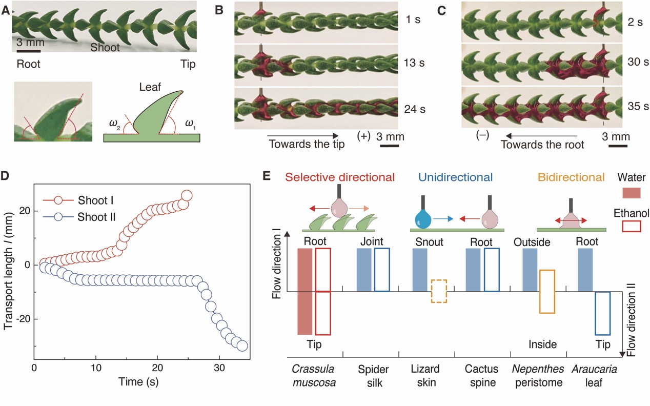若绿(Crassula muscosa)原产于干旱但多雾的南非和纳米比亚地区,它的茎叶很容易被雾气润湿,从而捕获雾滴,为其生长提供充足的水分。在给若绿浇水时,发现液体在水平放置的不同若绿茎上,竟然可以选择朝着茎尖或根部这两个截然相反的方向自发地单向流动,这与传统认知中一种液体只能沿固定方向流动的观点大相径庭。